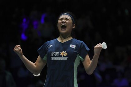 An Se Young on March 16 shouts for joy after winning the women’s singles title at the Badminton World Federation’s All England Open Championships at Birmingham Utilita Arena in Birmingham, the U.K. By...